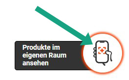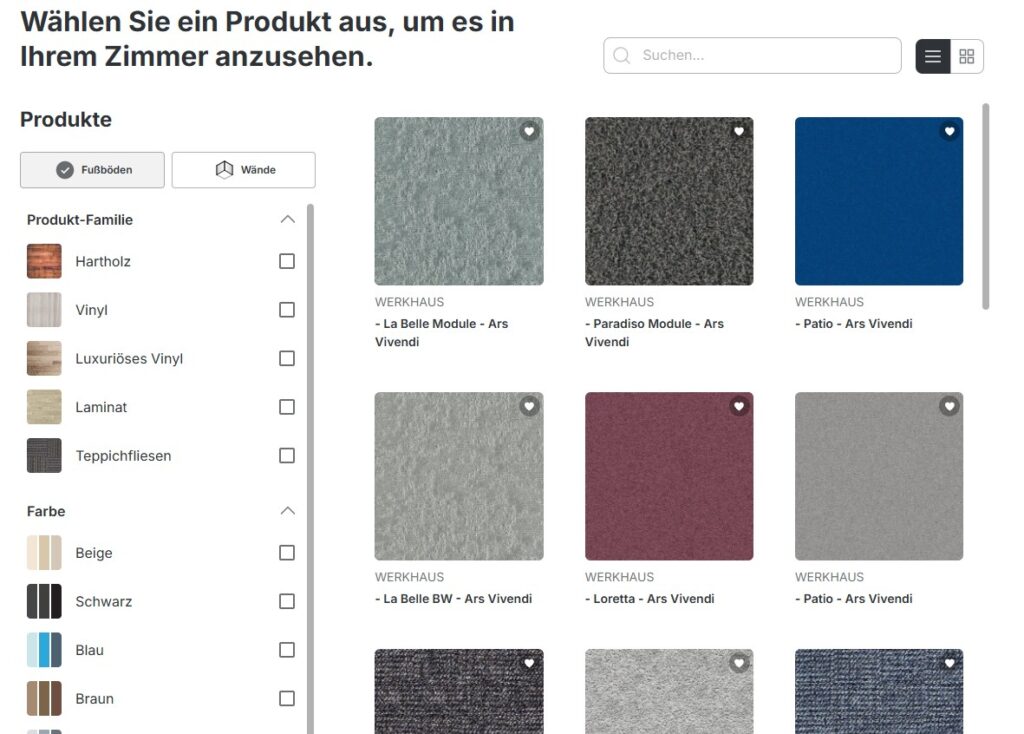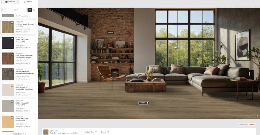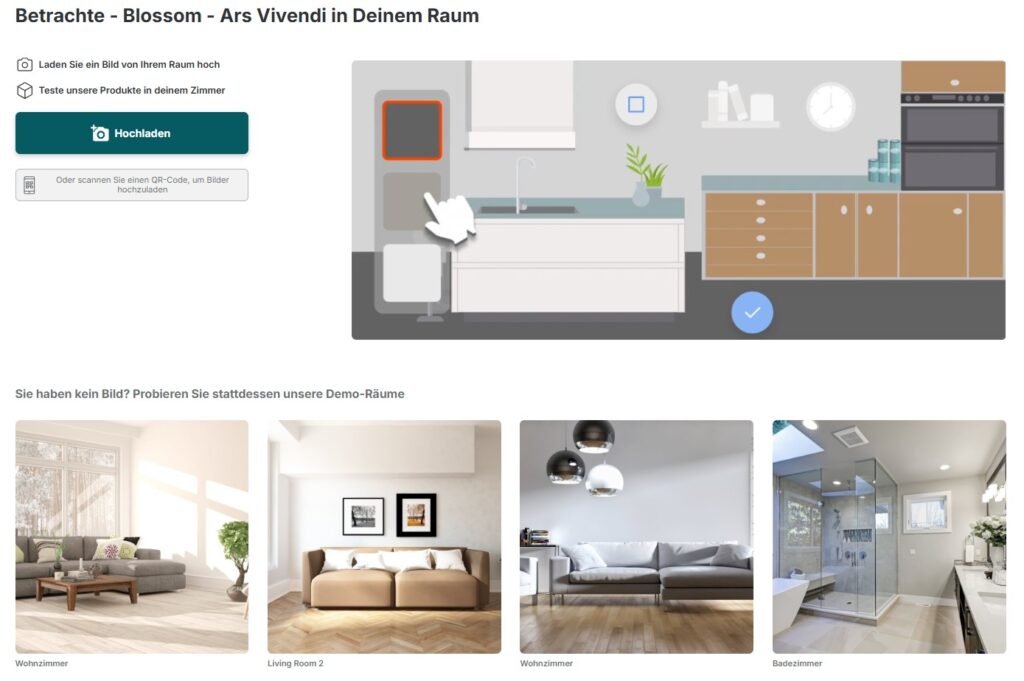 Im dritten Schritt besteht die Möglichkeit zwischen vorgegebenen Räumen auszuwählen oder ein eigenes Raumbild hochzuladen, sich dort die Produktauswahl anzeigen zu lassen und nach Belieben zu ändern.
