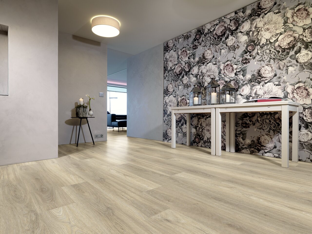 Designbelag in Holzoptik mit einer matten Oberfläche und einer erhöhten Rutschhemmstufe R10 sowie einer 4-seitigen Microfase zur vollflächigen Verklebung. Dieser Designbelag ist in 11 verschiedenen Eiche Dekoren erhältlich.
