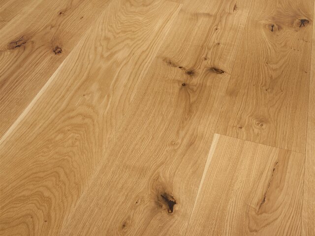 Attraktiver Parkettboden in Landhausdielen-Optik, mit Deckschicht aus Eichen-Massivholz in naturgeölt und einem Automatic-Click System für eine spielend leichte Verlegung. Die Dielen verfügen über eine umlaufende Minifase, die die Optik der verlegten Dielen dezent unterbricht und die typische Parkettoptik unterstreicht. Die Sortierung Rustikal wirkt wegen ihrer astigen Optik, des ausgeprägten Farbspiels und der deutlichen Maserung besonders ursprünglich. Der Parkettboden ist für eine Verlegung auf Fußbodenheizung geeignet.